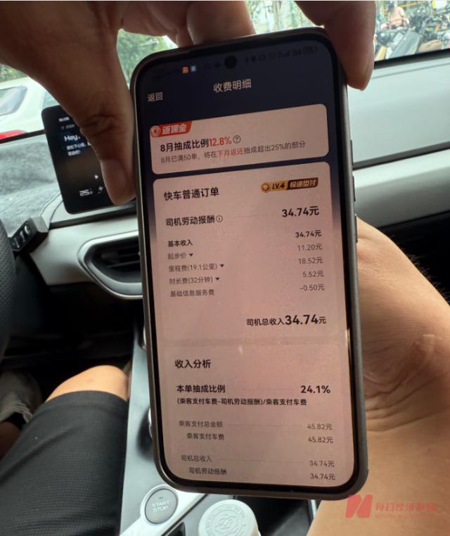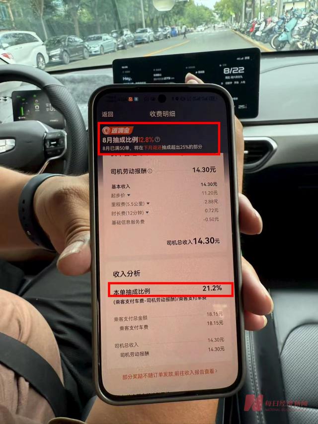 8 月 22 日,《每日经济新闻》记者通过打车体验与采访网约车司机发现,当前"普通快车"订单单笔抽成约为 21%~24%,但也有部分订单因司机当月跑满一定单数会在下月返还部分佣金,还有乘客使用大额优惠券等原因会对司机免佣,使得月平均抽成比例进一步下降。